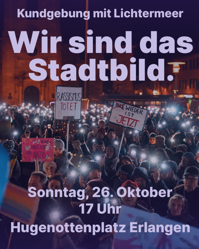 Unter dem Motto „Wir sind das Stadtbild“ ruft Fridays for Future Erlangen gemeinsam mit anderen Organisationen für diesen Sonntag, den 26.10.2025 um 17 Uhr zu einer Kundgebung am Hugenottenplatz auf. Dort soll es neben Reden auch Musik und ein Lichtermeer geben.