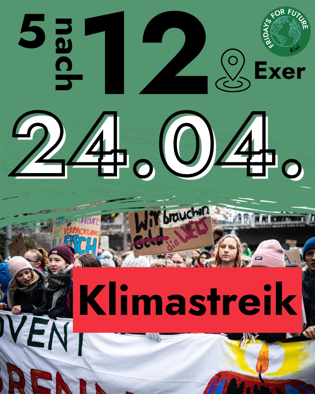 24.04.2026 Bundesweiter Klimastreik, Start 5 nach 12 Uhr auf dem Exer. Es wird zwei Zubringerdemos geben. Eine um 11:15 Uhr vom Audimax und ein Fahrradzubringer aus Flintbek um 10:45.