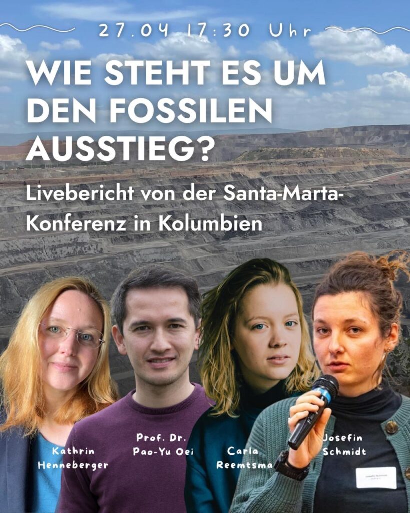 Aktuell findet in Santa Marta die erste globale Konferenz für den Ausstieg aus fossilen Energien statt. Aufgrund der Dringlichkeit der Klimakrise und den Auswirkungen aktueller geopolitischer Konflikte ist ein klarer Plan für einen gerechten Ausstieg aus der Verbrennung fossiler Rohstoffe unabdingbar. Aber wie steht es aktuell auf globaler Ebene um Verhandlungen für eine gerechte Transformation, und was passiert auf der ersten Konferenz zur Abkehr von fossilen Rohstoffen, die in Santa Marta, Kolumbien, stattfindet?