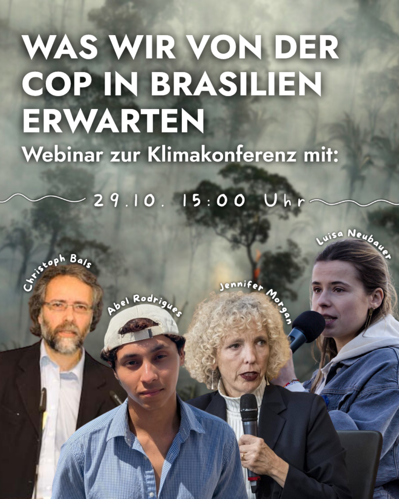 Wir diskutieren mit: Abel Rodrigues (FFF Brasilien), Jennifer Morgan (ehem. Klima-Sonderbeauftragte), Christoph Bals (Germanwatch) und Luisa Neubauer (FFF Deutschland)